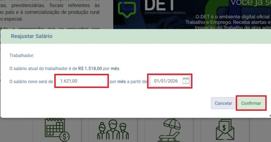 4. Insira o novo salário e a data do reajuste nos campos e clique em confirmar. Pronto, o eSocial foi atualizado com sucesso!