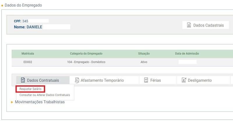 3. Clique em "Dados Contratuais" e depois em "Reajustar Salário";
