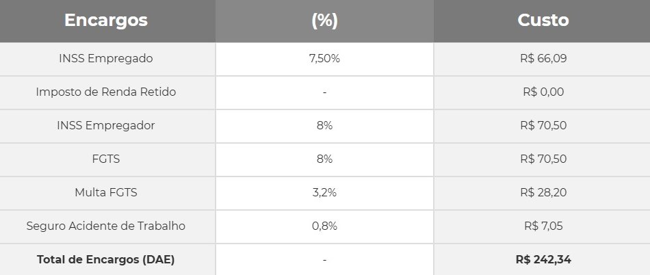 Teremos como base o salário mínimo no estado de São Paulo, atualmente em R$ 1.550,59 e a jornada de trabalho de 25 horas semanais. Veja o cálculo de todos os encargos que compõem a guia DAE na imagem abaixo. Você pode simular todos esses custos utilizando nossa calculadora de salário.