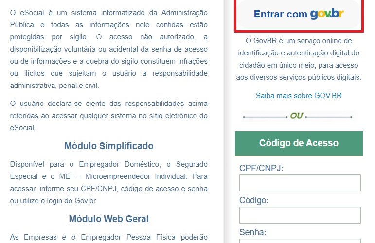 Nota: Segundo o Governo federal, o código de acesso será descontinuado, sendo a conta gov.br e o certificado digital as únicas formas de acesso aos módulos web do eSocial, a partir de dezembro/22.