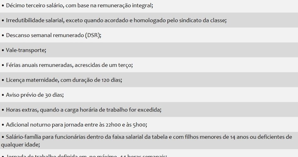 Além disso, existem inúmeros direitos que a legislação trabalhista brasileira prevê que devem ser garantidos pelo empregador. Confira os principais: